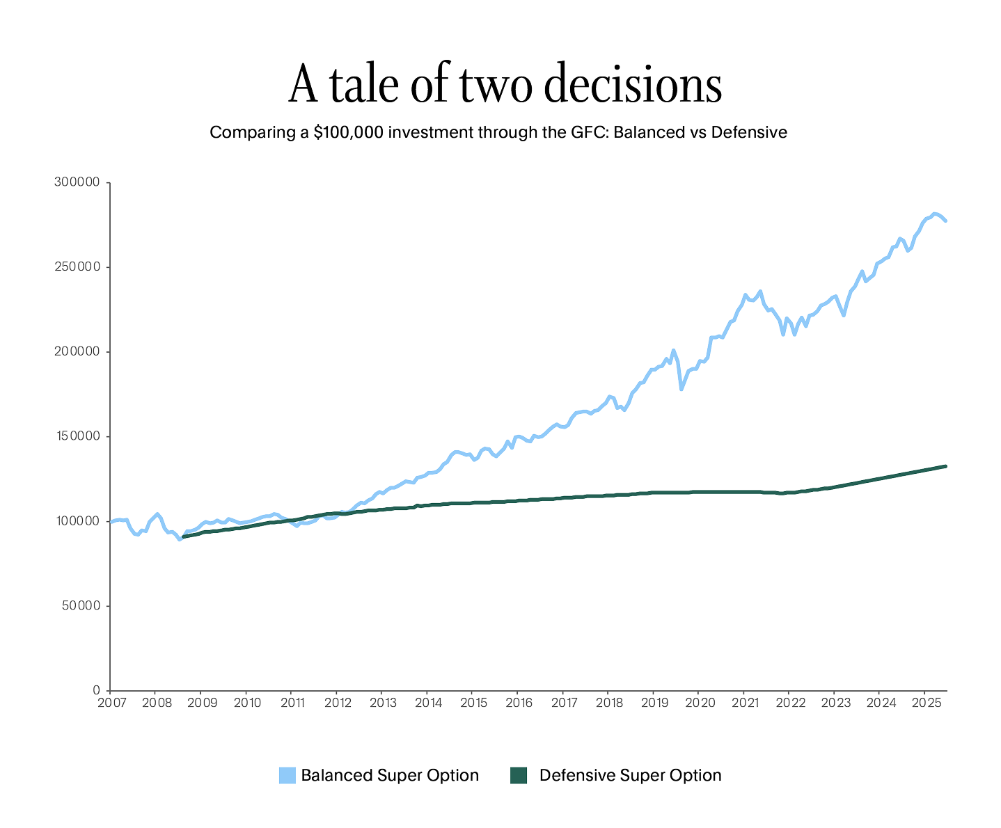 When balances fall, it can be tempting to move money into lower risk investment options to “stop the damage”. While these options may feel safer in the short term, they typically deliver lower returns over time. And switching after markets have fallen can mean: