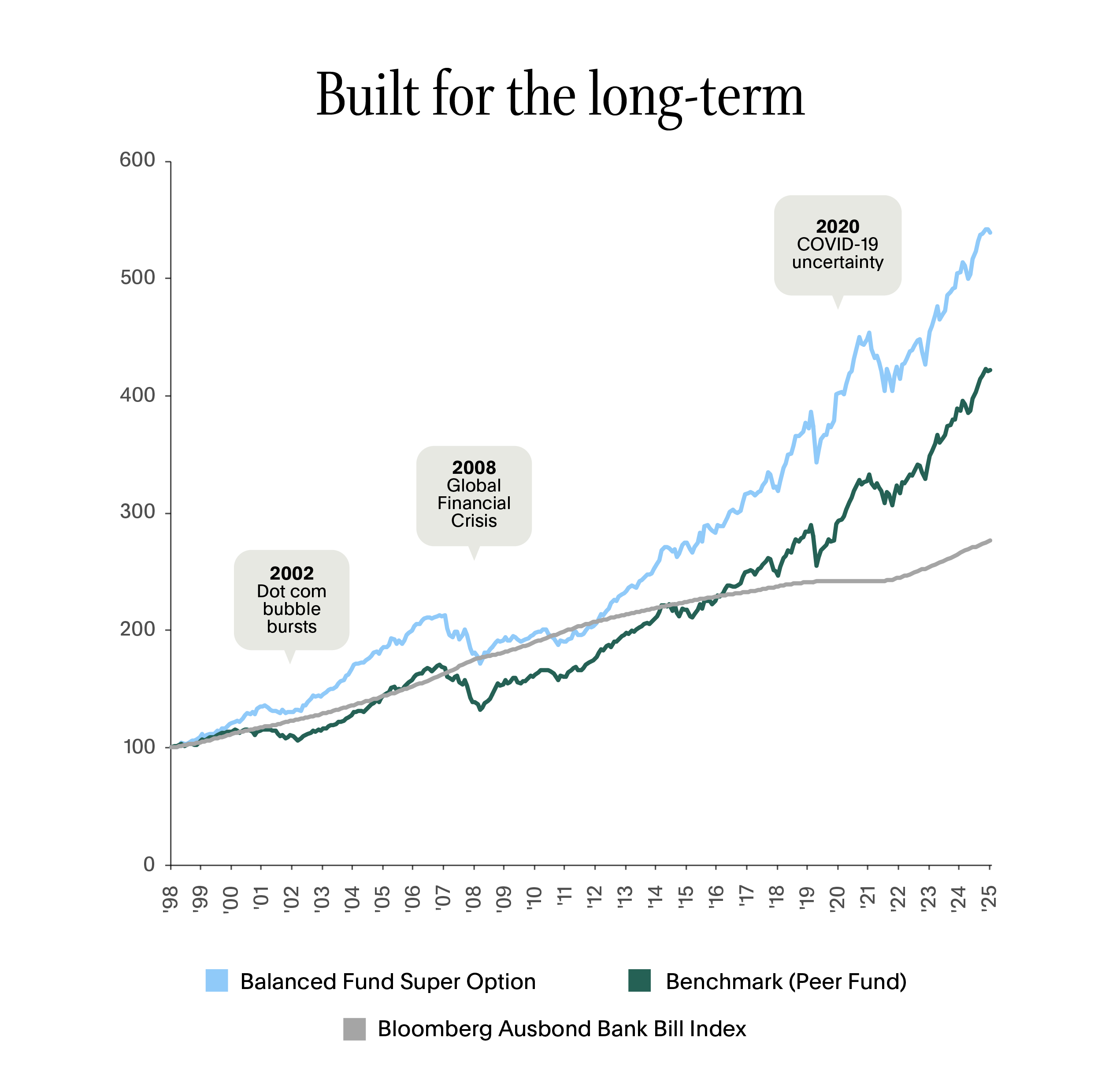 Balanced Fund Super Option return is net of investment fees, admin fees and tax, gross of $-based member fee. Past performance is not a reliable indicator of future returns.